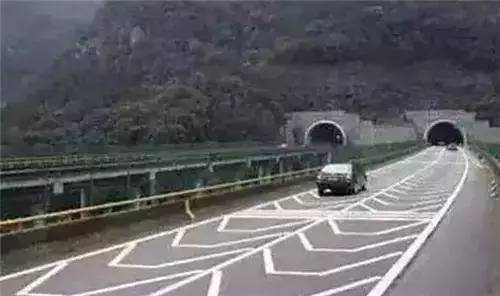 在隧道口,我们会看见这种标线。它一般开始于隧道外,一直延伸到隧道内,是提醒你减速慢行的标志。
