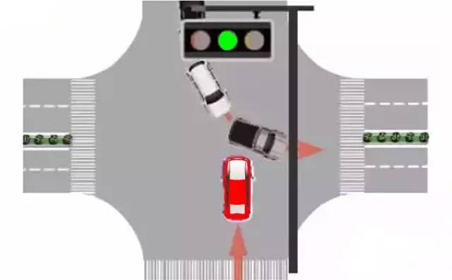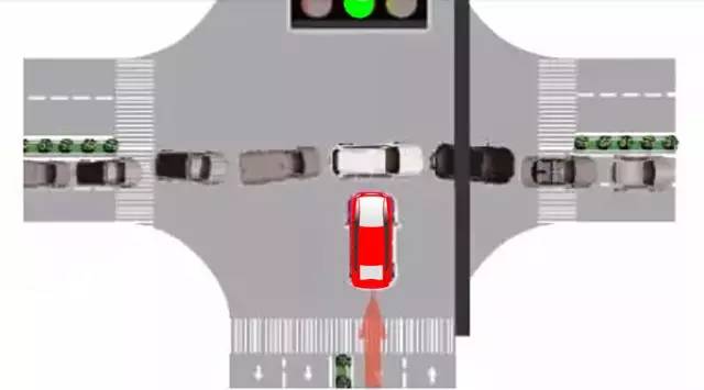 3、绿灯情况下的直行车辆,没有让行上一个红绿灯期间内,遗留在路口中间的对面路口开过来的左转弯车辆先走。