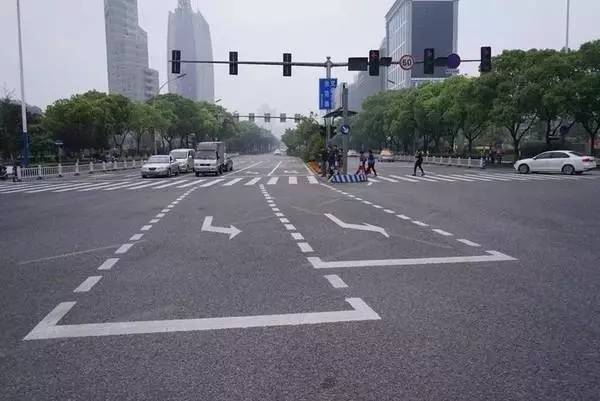 左转弯等待区:为白色虚线,用来指示左转弯车辆可在直行绿灯亮且左转红灯亮时,进入待转区等待左转。等待区有个明显的特点,一定有左转弯箭头,一定有停止线!