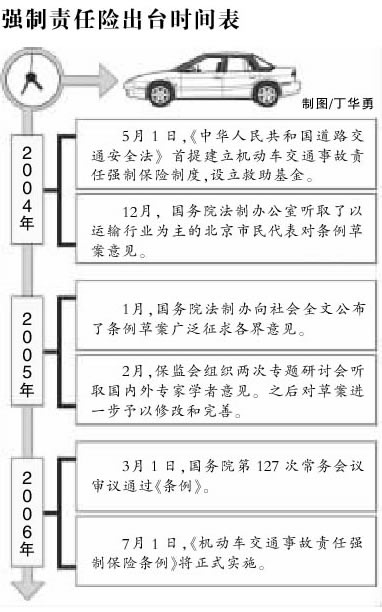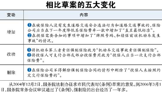 《条例》分为总则、投保、赔偿、罚则和附则共五章四十六条,自2006年7月1日起将正式施行。(完)