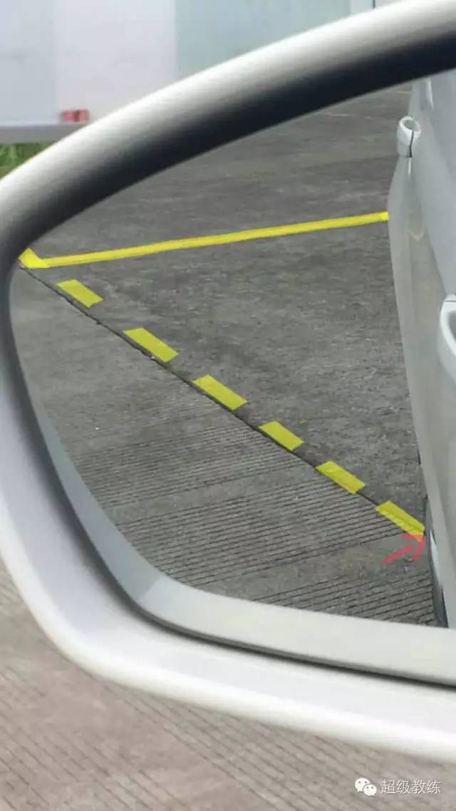4、方向回正后,还是看左镜,待从左镜里看到左后轮压到虚线时,向左打死方向。注:这个方法是适合考场上侧方位入库口有虚线的方法。