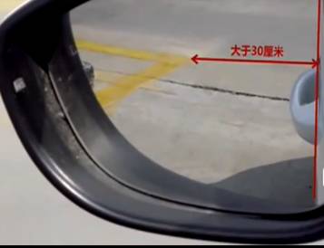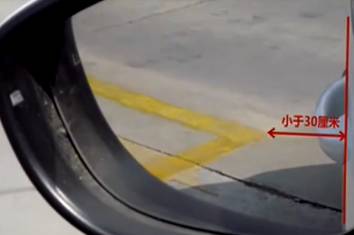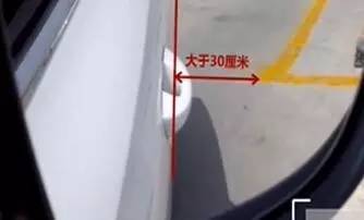 3、看右后视镜中车身与库区左前角线距离,做调整轮入库。当大于30厘米时,向右打半圈方向;小于30厘米时,向左打半圈方向。