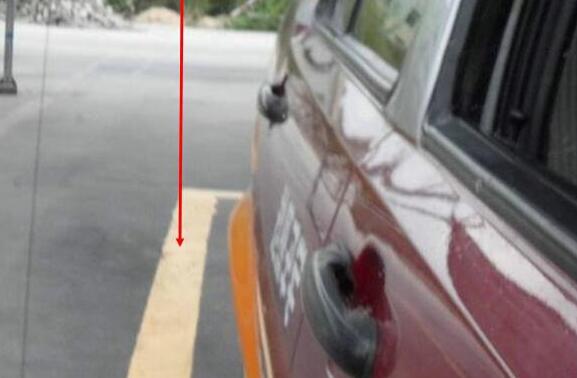 如图所示,后视镜视野中车后身与线的距离略小时,车身与库边线平行。