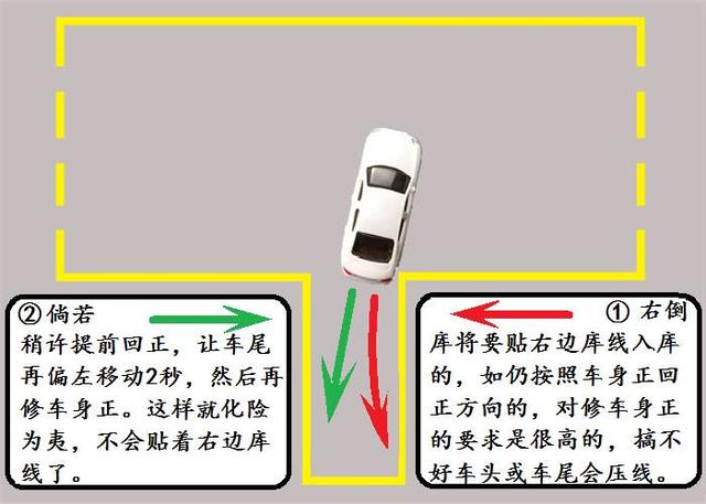 科目二倒库,难免会出现车身紧贴一侧库边线入库的情况,一不小心就可能压线,该如何调整呢?