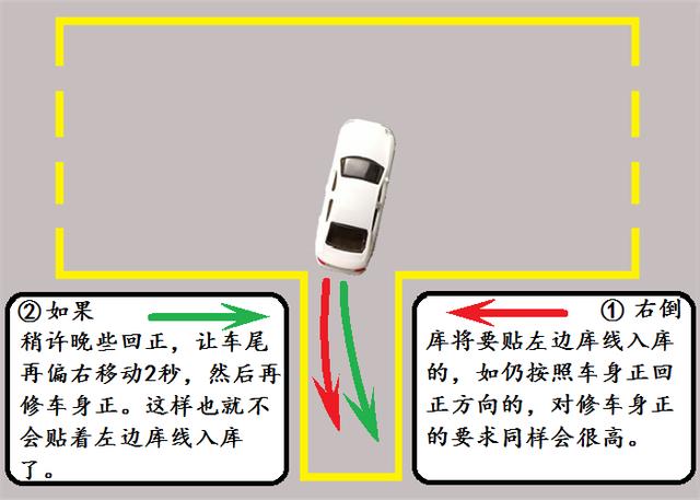 左、右入库都可以使用以上方法,调整后,按原先剩余的动作要领(修车身正和停车)做完就OK了。