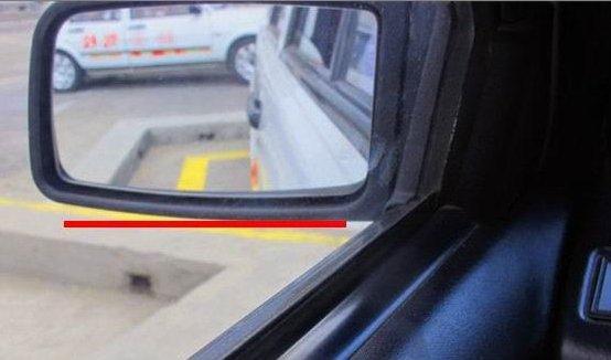 6、观察左后视镜,当后视镜下沿与黄线重合时,停车。语音提示"倒库准确"