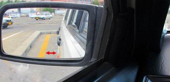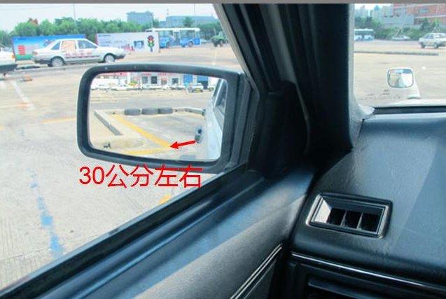 4、看左后视镜,注意观察车后轮与左库角的距离,如果车后轮距离左库角刚好在30cm,那就不需要修正方向,直接继续向后倒车即可。如果车轮与库角小于30cm的话,可以通过回一点方向盘来保持30cm左右的距离。