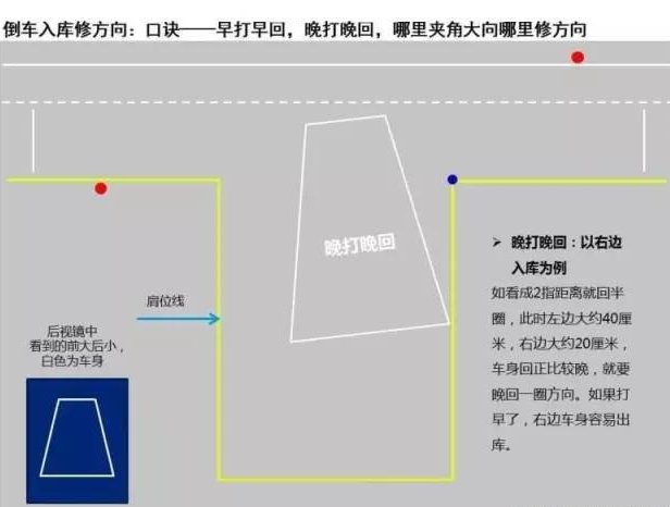 大部分教练倒库的方法都遵循这个过程:右打死-回方向-右打死进库-回正方向-修正车身。