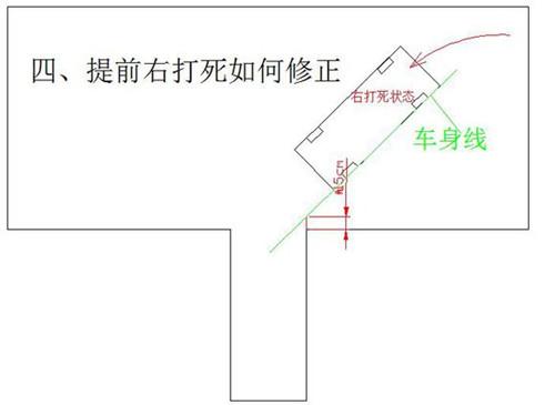 提前右打死了,倒车至这种状态时,若继续倒车,明显右边会压线,此时需要修正。