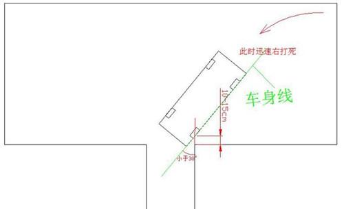 ③关注右后轮,待右后轮正好压在库右延长线上,迅速右打死,此时距离为10cm-15cm,如图。