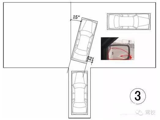 车身偏斜15度左右,从右反光镜看车身与车库线距离如图,可以辨别车可以进入车库,方向不变,继续倒车。