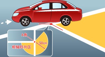 第四步,在停车状态下继续将方向盘向左打到底,慢慢倒车约50cm后停车,这时左后轮的中心停在图中标注为“枢轴转向区”的外缘上。