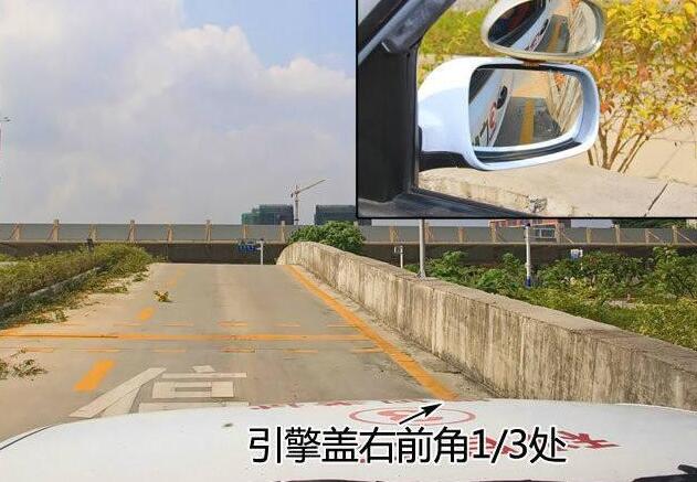 当发现右侧雨刷处的节点纸和右边停车杆重合时迅速踩离合刹车;有的教练是让学员看左侧后视镜下沿完全看到坡道实全部黄线时停车。