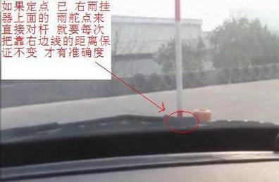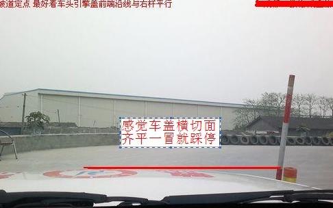 所以刚开始练的时候最好自己下车看是否到位,确认好自己看出去能看得到的引擎盖最前端横切面与杆的关系后,再反复练习。