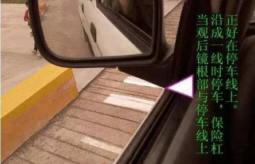 2、观察左后视镜,当○1线和左后视镜下沿与眼睛成一线时,踩下离合、放开油门,当○3线中心和左后视镜下沿与眼睛成一线时,踩刹车、拉紧停车驻动器,停车到位;