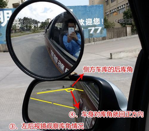 2、前库角在右后视镜中消失就右打死方向盘的时机。