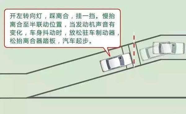 1、坡道起步:车辆停稳后,汽车前保险杠要垂直对准桩杆线,保险杠不得超过或退至桩杆线50公分以外的区域,且前后轮不得轧道路边缘线。