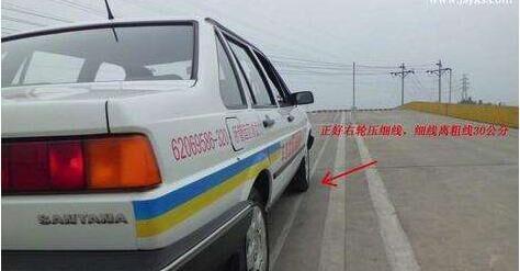 2、顺正车后,挂上一档慢慢前行,(注意:这时要靠右打一点方向),因为坡道定点停车对边线的要求特别高,只有边距达到30cm,才算合格。因此要尽量在上坡前把车辆向右稍稍移动,大约离边线30cm左右了再回轮,继续前进。