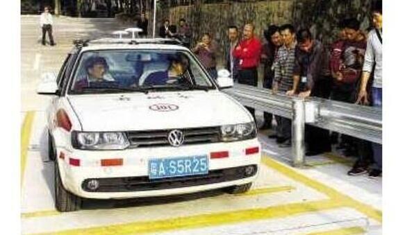 3、爬到坡上后,要注意看好坡道停车处的标杆和停车虚线标志。这时一定要集中注意力,车速尽量放慢(可以微微的踩哈离合),对准坡顶标志慢慢往上爬就行。