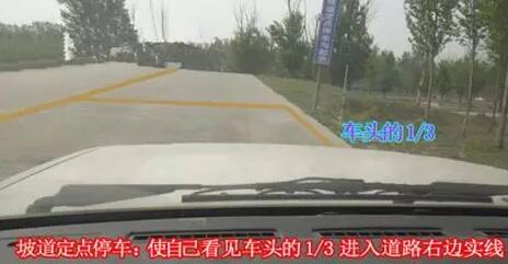 1、 上坡前,要在坡下前后调整车身,直到车身右侧与考场右边线平行,并且使车头右1/3的地方压右边线,最大程度不能超过车头1/2(很多考场在地面上也有参 考线,这时候只要将右车筋位置对准该线就行了)。这时候,车子与右边线距离不超过30公分。对准线是正确停车的第一步,没调整好就不要贸然上坡,因为坡道长度有限,上坡过程中调整车子难度太大。