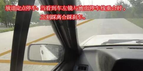 2、上坡时,挂一档,不踩油门,车子要慢,左右脚准备好,当看到左后视镜下沿与地面停车线重合时(有的考场地面有参考线,左门把手中央压参考线的时候),立即踩离合踩刹车,记住要刹死,保证车子不能后溜。