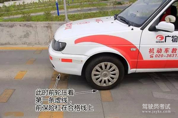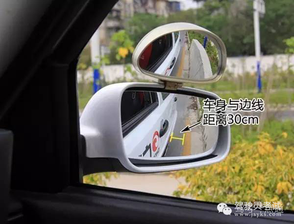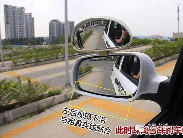 保持车身与右侧边线30cm左右后,就要注意定点停车了。此时,稍压离合,车速慢一点,慢慢靠近停车点。当左后视镜下沿与第二条粗黄线齐平时,先踩刹车后踩离合,将车子停稳。此时,车内语音会提示"定点准确"。