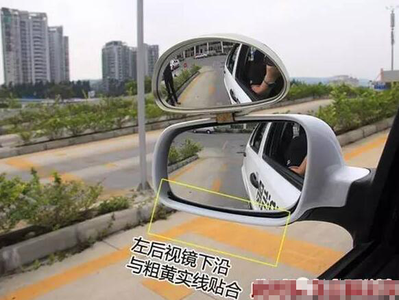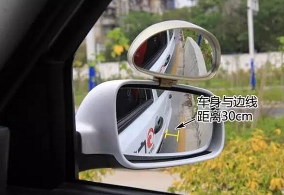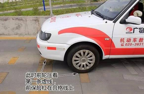 第二步:保持车身与右侧边线30cm左右后,就要注意定点停车了。此时,稍压离合,车速慢一点,慢慢靠近停车点。当左后视镜下沿与第二条粗黄线齐平时,先踩刹车后踩离合,将车子停稳。此时,车内语音会提示"定点准确"。