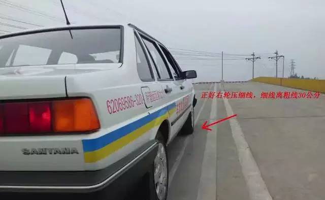 3、挺稳后,车轮要压细边缘线,离粗线30公分左右。