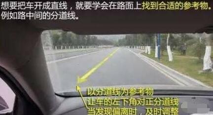 其次要选好参照物,可以以右边的马路牙子作为参考,用余光看下,保持和车子平行,基本就是保持直线了。