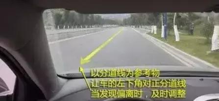 行驶时,注意车身两边到路边变线的距离,可以将分道线作为参照物,让车的左下角对正这条线,发现偏离时及时调整,马路牙子也可以作为参照物。