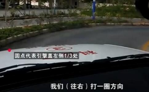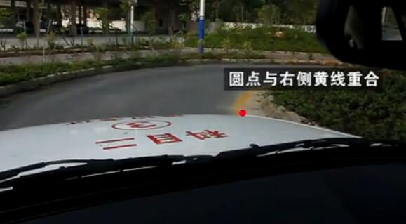 3、引擎盖左侧1/3处圆点碰到左边黄线,向右打一圈方向;