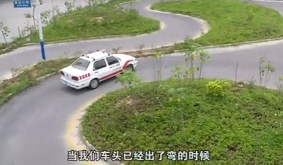 2、转过第一个弯,准备过第二个右转弯的时候,看车引擎盖右边顶点碰到右边的黄线,回正方向;