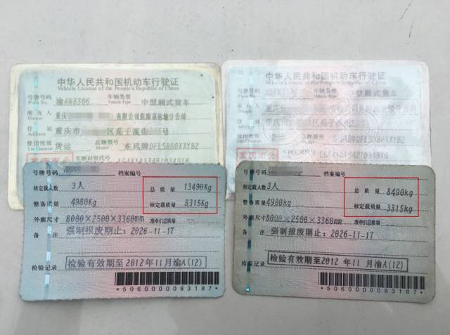 检查过程中,民警居然发现了两套行驶证,一个行驶证上的核载质量为3315kg,另一个行驶证上的核载质量为8315kg,足足多出5吨。而经验丰富的民警立马通过防伪反光标识模糊不清的情况确认核载质量较大的行驶证为假证。