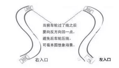 入口有两种方向,左入口和右入口。左入口时,车辆尽量靠近右边线后,再左转方向盘;右入口时,相反,车辆尽量靠近左边线后,再右转方向盘。因为考虑到内轮差,避免在转弯时,后轮压线。