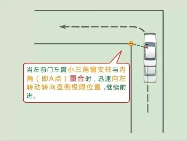 3、继续向前开,当从驾驶员角度观察到左前侧车窗的小三角窗柱与直角弯道的内角(下图黄圈处)重合,马上向左打死方向盘。