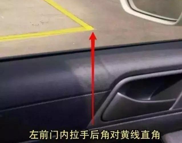 2、待雨刮器突出点快要碰到前面的线时,马上侧头看左前门内拉手,当左前门内拉手后面的尖角对到线直角(三点成直线对到)方向盘向左打死,待车走直方向回正。