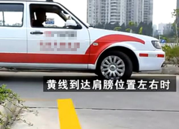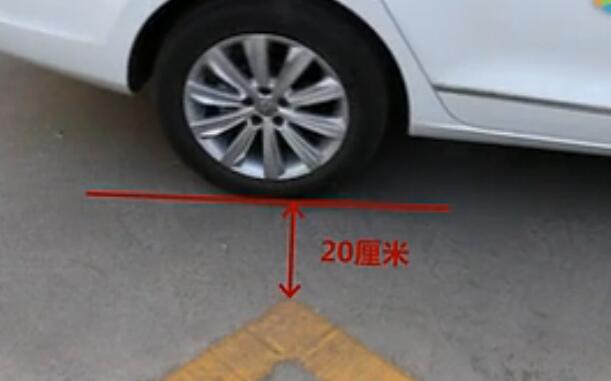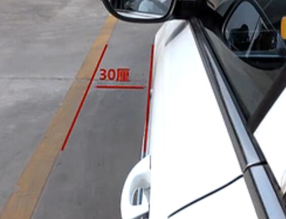 3、同时注意观察右侧后视镜,观察右后车轮不要轧到黄线。