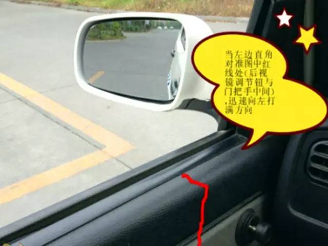 当后视镜下沿与黄线平齐时,就要向左(右)打方向,快速打死方向盘。看到车头对准出口,就迅速将方向回正。车速最好保持在一档半离合,打方向时一定要果断,均匀。
