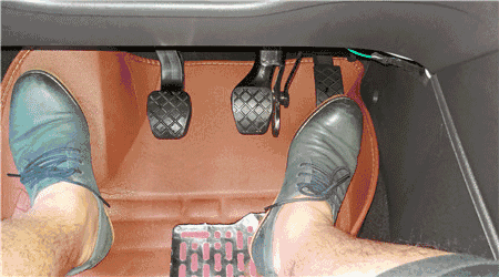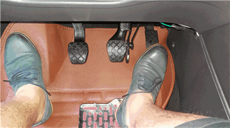 行驶中右脚需切换控制油门与脚刹两个踏板,起步与加速时使用油门踏板,停车与减速时使用脚刹踏板。